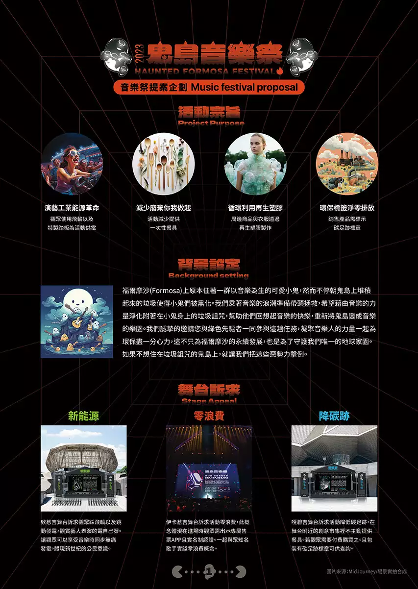福爾摩沙島上住著一群以音樂為樂的小鬼,然而隨著島上不斷堆積的垃圾,使得小鬼們黑化成三種污染地球資源的惡鬼,島嶼也逐漸被大家謠傳成可怕的鬼島而避而遠之,因此我們決定透過這場音樂祭以新動能發電、零浪費及降低碳足跡為主軸創造一場「綠」音樂盛典,希望大家透過音樂的力量一起討伐惡鬼讓他們變回原樣,同時也期望鬼島音樂祭觀眾們為永續地球盡一份心力。
