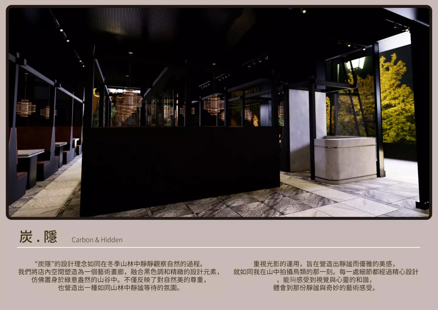 炭隱的設計理念如同在冬季山林中靜靜觀察自然的過程。 我們將店內空間塑造為一個藝術畫廊,融合黑色調和精緻的設計元素, 仿佛置身於綠意盎然的山谷中。不僅反映了對自然美的尊重, 也營造出一種如同山林中靜謐等待的氛圍。