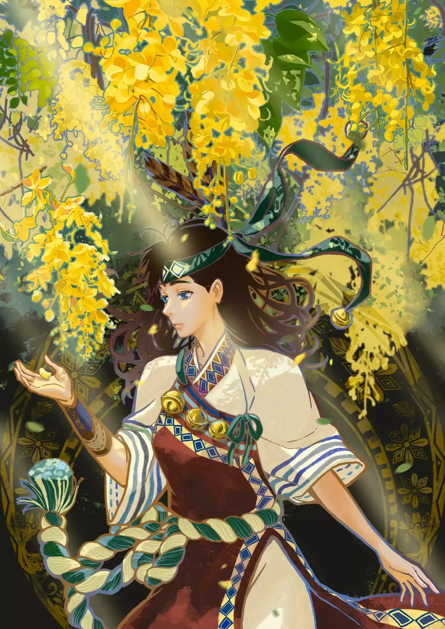 讓人感覺翹蓬勃, 充滿大自然獨有的生機和傳統圖騰輔助,組成這幅作品原住民又以豐年祭為名,黃色花瓣有秋天之感。
