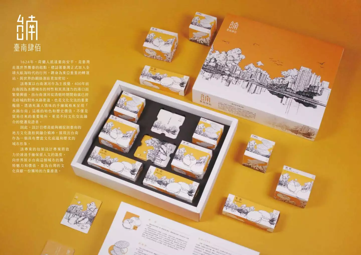 此包裝設計,將致力於用手繪保留人文的溫度,向世界展示台南這個城市的魅力和價值,並為台灣的文化貢獻一份獨特的力量去向前推進。